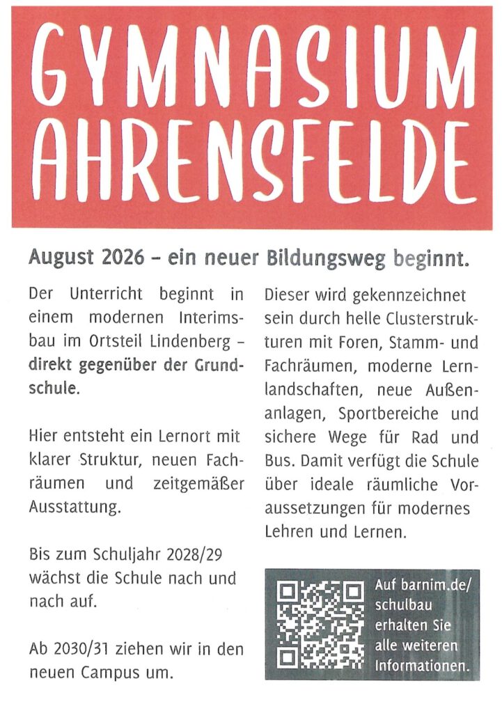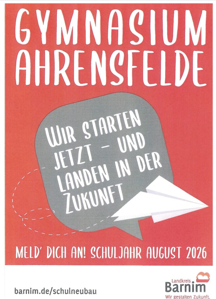 Wir freuen uns mitzuteilen, dass die zukünftige Schulleitung des neuen Gymnasiums Ahrensfelde zu einem Informationsabend einlädt. Vorgestellt werden der geplante Schulstart im August 2026, das pädagogische Konzept sowie wichtige Hinweise zur Anmeldung.